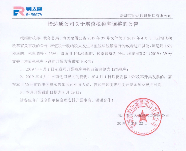 怡達(dá)通公司關(guān)于增值稅稅率調(diào)整的公告