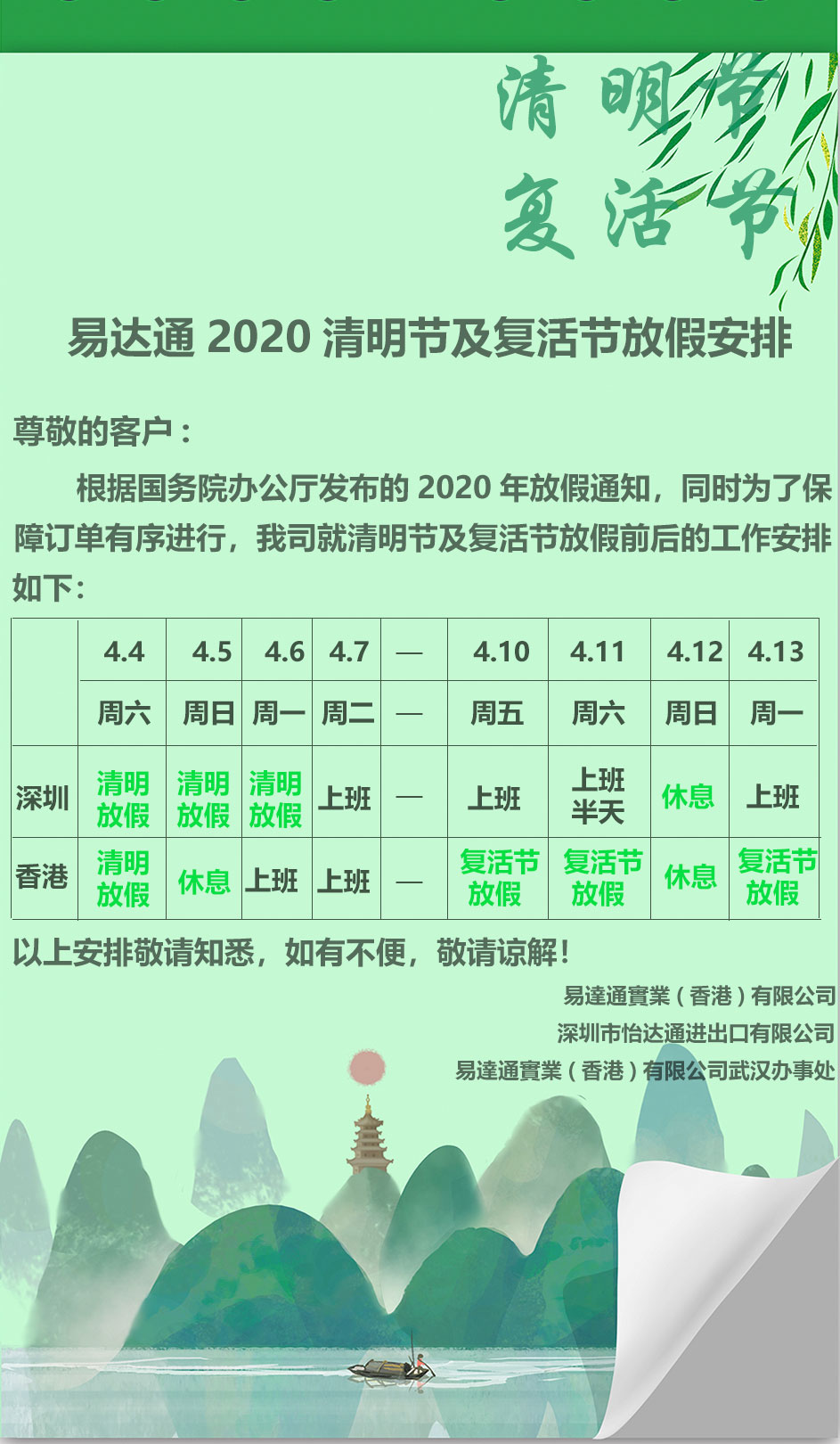 易達通2020清明節(jié)及復(fù)活節(jié)放假通知