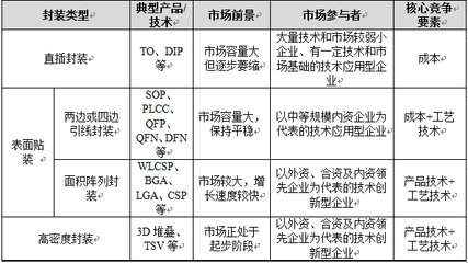我國(guó)目前集成電路封裝市場(chǎng)中,DIP、SOP、QFP、QFN/DFN等傳統(tǒng)封裝仍占據(jù)我國(guó)市場(chǎng)的主體,約占70%以上的封裝市場(chǎng)份額;BGA、CSP、WLCSP、FC、TSV、3D堆疊等先進(jìn)封裝技術(shù)只占到總產(chǎn)量的約20%。主要市場(chǎng)參與者包括大量的中小企業(yè)、部分技術(shù)領(lǐng)先的國(guó)內(nèi)企業(yè)和合資企業(yè),市場(chǎng)競(jìng)爭(zhēng)最為激烈。華潤(rùn)安盛科技等中等規(guī)模國(guó)內(nèi)企業(yè)由于工藝成熟、在直插封裝和表面貼裝中的兩邊或四邊引線封裝方面有技術(shù)創(chuàng)新,質(zhì)量管理和成本控制領(lǐng)先,近幾年來(lái),經(jīng)濟(jì)社會(huì)效益好,企業(yè)發(fā)展快。在表面貼裝的面積陣列封裝領(lǐng)域,除了有技術(shù)、市場(chǎng)優(yōu)勢(shì)的跨國(guó)企業(yè)外,我國(guó)長(zhǎng)電科技、通富微電、華天科技等企業(yè)憑借其自身的技術(shù)優(yōu)勢(shì)和國(guó)家重大科技專(zhuān)項(xiàng)的支持,逐步接近甚至部分超越了國(guó)際先進(jìn)水平。高密度封裝工藝目前仍處于研發(fā)階段,尚未實(shí)現(xiàn)量產(chǎn)。