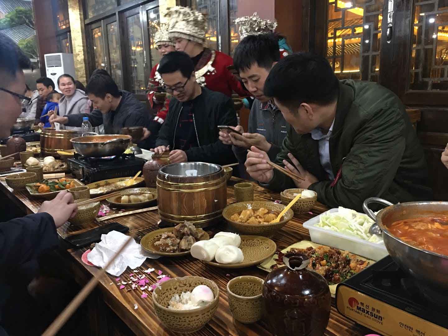 我們品嘗千戶苗寨已有幾千年的歷史的最具民族特色最隆重最高形式的待客禮儀餐———長桌宴。大家歡聲笑語舉杯同慶,共享此刻的美好時光。