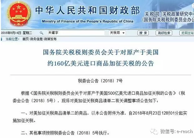 財政部于8月8日發(fā)布了對原產美國的部分商品加征關稅的公告,主要闡述本次加征關稅涉及的160億美元商品,以及將于2018年8月23日起開始執(zhí)行加征。