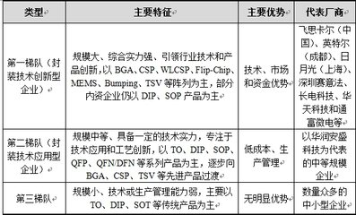 目前,國(guó)內(nèi)三大封測(cè)企業(yè)憑借資金、客戶服務(wù)和技術(shù)創(chuàng)新能力,已與業(yè)內(nèi)領(lǐng)先的外資、合資企業(yè)一并位列我國(guó)封測(cè)業(yè)第一梯隊(duì);第二梯隊(duì)則是具備一定技術(shù)創(chuàng)新能力、高速成長(zhǎng)的中等規(guī)模國(guó)內(nèi)企業(yè),該類(lèi)企業(yè)專(zhuān)注于技術(shù)應(yīng)用和工藝創(chuàng)新,主要優(yōu)勢(shì)在低成本和高性價(jià)比;第三梯隊(duì)是技術(shù)和市場(chǎng)規(guī)模均較弱的小型企業(yè),缺乏穩(wěn)定的銷(xiāo)售收入,但企業(yè)數(shù)量卻最多。